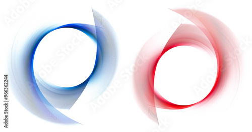 © Svetlana, Fototapeta premium The round frames are created with red and blue striped curved planes. Set of graphic design elements on a white background. Icon, logo, symbol, sign. 3D rendering. 3D illustration.