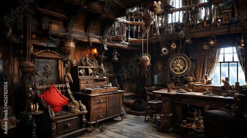 Fototapeta premium The rustic yet commanding cabin of a pirate ship's captain, filled with...