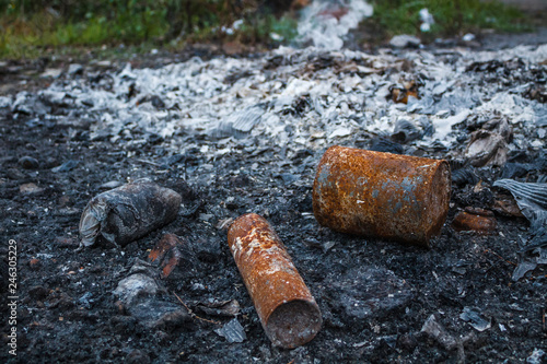 Fototapeta premium The rusty burned-down metal tins lie in ashes