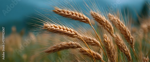 © ckybe, Naklejka premium The rye grain stalk with ripe seed clusters glowing in soft daylight breeze