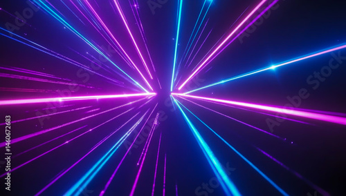 © SHUMAYA, Naklejka premium The 80s-inspired retro grid background features vibrant neon blue and purple light rays, evoking a nostalgic aesthetic.