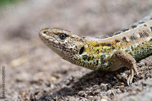 Naklejka premium The sand lizard (Lacerta agilis, close-up. Lizard raised on its paws.