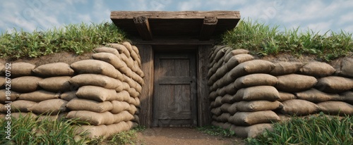 Naklejka premium The sandbag fortified bunker entrance stands firm evoking safety and...