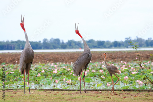 Naklejka premium The sarus crane is a rare, large bird that lives in wetlands and organic rice fields in Buriram Province, Thailand.