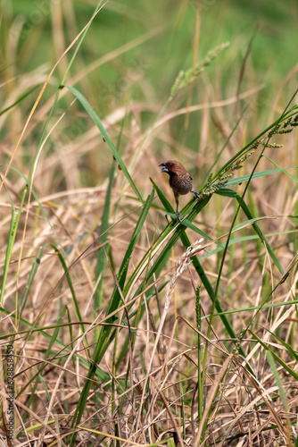 © Eko, Fototapeta premium The scaly breasted munia or spotted munia perching on grass, Lonchura punctulata, known as nutmeg mannikin or spice finch, is a sparrow sized estrildid finch