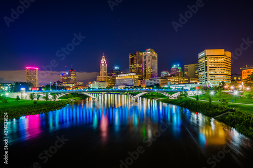 Naklejka premium The Scioto River and Columbus skyline at night, in Columbus, Ohio.