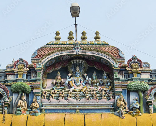 © anna_purna, Fototapeta premium The sculpture of Vishnu with Lakshmi and other gods on one of the walls of the temple complex is Shriranganath XVI century in Trichy, South India.