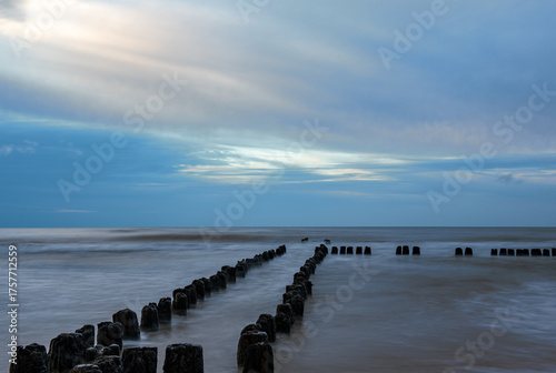 Fototapeta premium the sea during the blue hour, posts, pilings