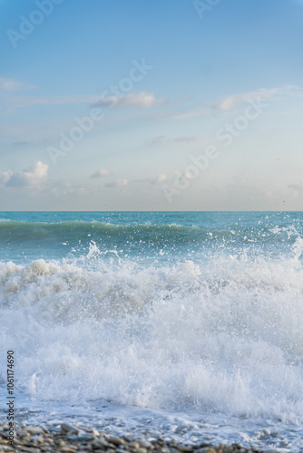 Fototapeta premium The sea waves roll onto a pebble sea shore against a blue sky with clouds.
