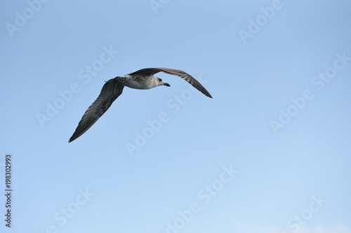 © pridannikov, Obraz premium The seagull flies its wings wide against the blue sky