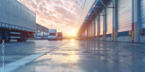 © kiimoshi, Obraz premium The semi-trucks are parked outside the warehouse at sunset.