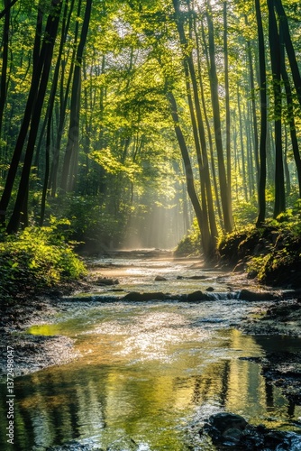 © Lindamar, Obraz premium The serene Bamboo Grove, illuminated by sunlight and sustained by gentle streams.