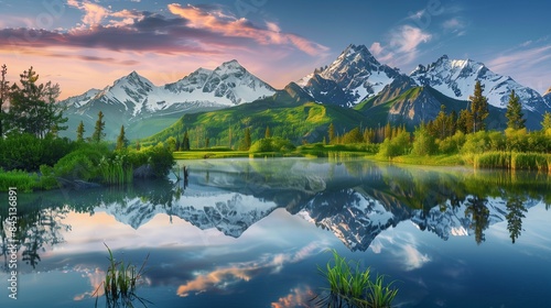 © Sawera, Obraz premium The serene beauty of an alpine lake at sunrise, with snow-capped peaks and vibrant greenery mirrored in the still waters