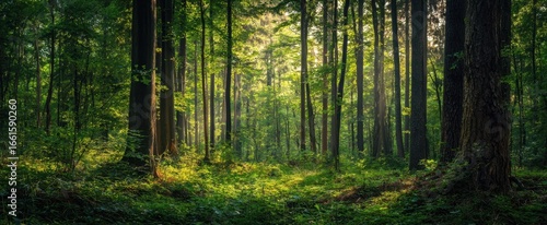 Fototapeta premium The serene forest bathed in gentle sunlight offers a tranquil escape into...