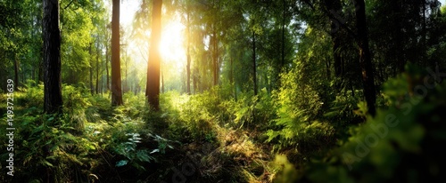 Fototapeta premium The serene forest bathed in soft sunlight creates a peaceful atmosphere.