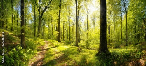 Fototapeta premium The serene forest path illuminated by vibrant sunlight through lush trees.