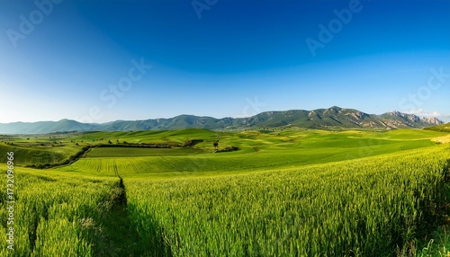 Fototapeta premium The Serene Landscape Features Lush Green Fields Stretching Towards Distant Mountains Under A Clear Blue Sky The Spanish Countryside