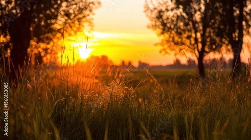 Fototapeta premium The serene sunset illuminating grass under a beautiful evening sky.