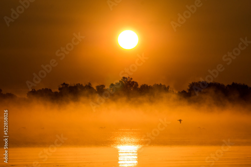 © Konstantin, Fototapeta premium The setting sun against the backdrop of a soaring river mist