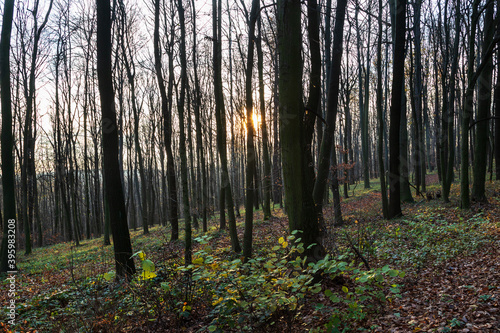 © Roman Bjuty, Obraz premium The setting sun in the woods among the trees.