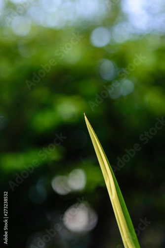 Fototapeta premium The sharp tip of the leaf is slender. The background image is a green bokeh...