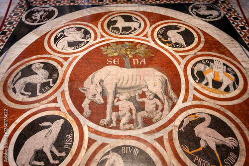 © boryanam, Obraz premium The She-Wolf of Siena Mosaic Floor. Romulus Remus mosaic