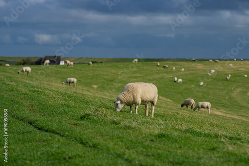 Fototapeta premium The sheep lamb in the verdant meadows. Sheep on an farm. Sheep eating grass on a field. Sheep grazing in an alpine meadow.