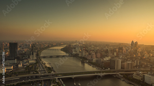 © 望 辻本, Fototapeta premium 夕日に染まる信濃川。The Shinano River dyed in the setting sun.