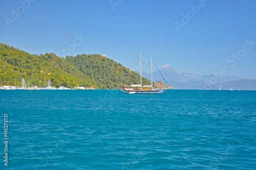 Obraz premium The ship on the background of the bright blue Mediterranean sea and the mountains
