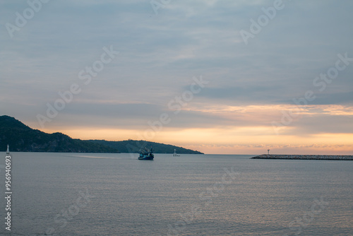 © noppakit rattanathon, Fototapeta premium The ship sets out to sea in the morning.