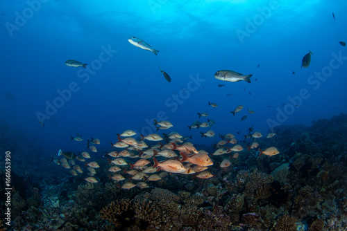 © prochym, Fototapeta premium The shoal of lutjanus gibbus is swimming above the seabed. A paddletail snapper is swimming near the Fakarava atoll. A shoal of snappers fish in the Pacific Ocean.