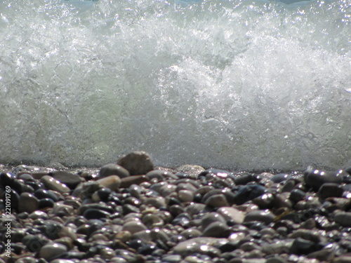 © HelenkaNNN, Fototapeta premium The shore of the sea close-up: a pebble from a pebble with sand and an incident wave. Beautiful background.