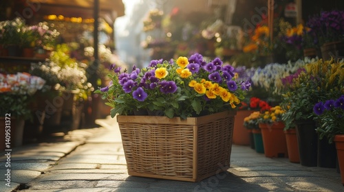 Fototapeta premium The sidewalk is decorated with an array of flowers in colorful baskets, generating a lively and welcoming environment