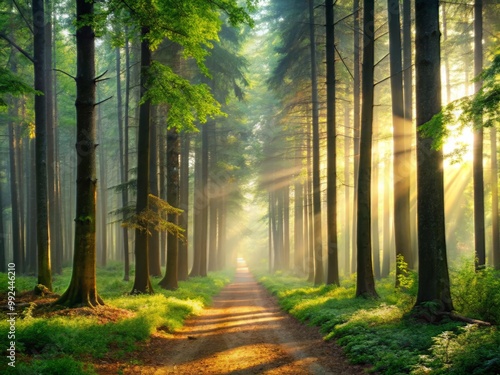 © Arethaawykoff, Fototapeta premium The silent forest looms over the solitary path, shrouded in misty morning light.