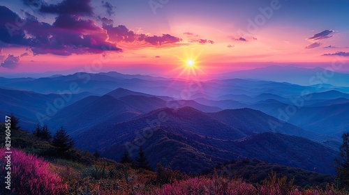 © Sang, Obraz premium The silhouette of a mountain range, standing tall against the backdrop of a colorful sunrise.