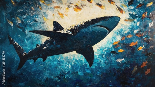 © P.G, Obraz premium The silhouette of a shark illuminated by light filtering through water, with vibrant schools of fish adding movement.