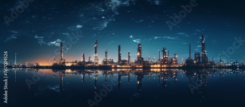 © AkuAku, Fototapeta premium The silhouette of a towering oil refinery is mirrored in the calm waters at night, creating a stunning reflection against the city skyline
