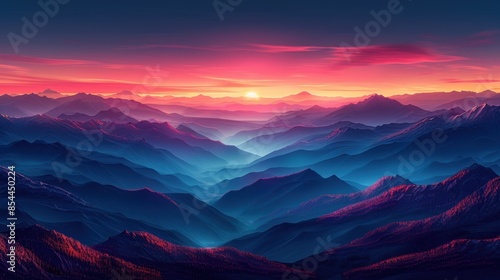 © MakoPoko, Obraz premium The silhouette of distant mountains stands stark against a sky ablaze with the warm colors of sunset. Shades of pink, orange, and purple blend harmoniously, creating a mesmerizing gradient across the