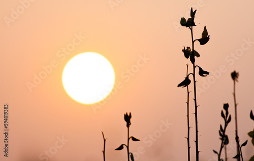 Obraz premium The silhouette of the flower against the sun's rays. Growing sun. Romantic natural atmosphere.