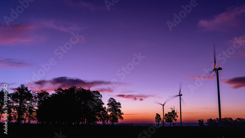 Fototapeta premium The silhouette of three modern windmills in a colorful sunset, next to a...