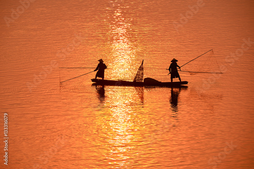 Naklejka premium The silluate fisherman boat in river on during sunrise,Thailand