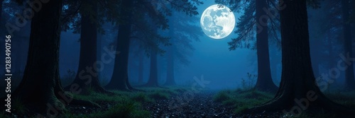 Naklejka premium The silver glow of the full moon illuminates the dark forest floor, mystical...