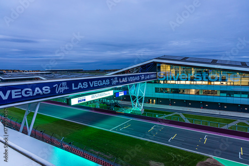Obraz premium The Silverstone pit building lit up at twilight, ideal for motorsport,...
