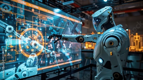 Fototapeta premium The simulation robot pointed at the large screen and introduced complex data.