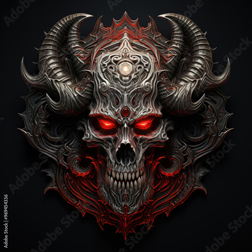© Oleksandr, Fototapeta premium The skull of a demon with horns and red fire