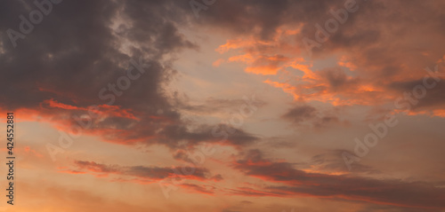 Fototapeta premium The sky at sunset before bad weather. Low red sunlight illuminates thunderclouds.