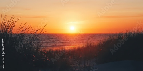 Fototapeta premium The sky glows in shades of orange and pink as the sun sets over gentle waves. Grassy dunes frame the beach, creating a serene atmosphere in the evening light