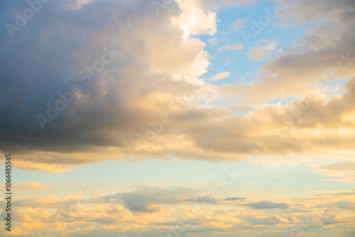 Fototapeta premium The sky is adorned with soft, fluffy clouds illuminated by warm golden light as day transitions into night, creating a peaceful atmosphere in the horizon.