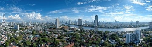 Obraz premium The skyline of Bangkok on sunny day, with the Grand Palace, Chao Phraya River prominent, captured from high vantage point. Blue sky with minimal clouds, urban landscape, cityscape photography