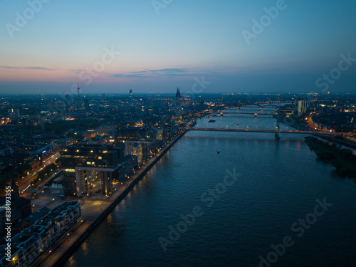 Naklejka premium The skyline of Cologne, Germany just after sunset. Inland cruise ship on the river rhine passing.